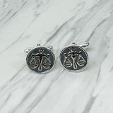 Libra Cufflinks: These sterling silver cufflinks show balanced Scales hanging gracefully, finished with an oxidized look that adds elegance to the design. The Libra zodiac sign represents fairness and a love for harmony.