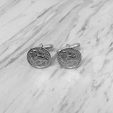 Leo Cufflinks: Showcasing a strong Lion in a confident walking stance with its tail curved upwards on sterling silver cufflinks, enhanced by a rough backdrop. This Leo zodiac sign is known for its courage and having a big heart.