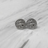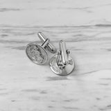 Virgo Cufflinks: These sterling silver cufflinks feature a kneeling figure holding a shaft of wheat, set against a textured backdrop that adds a classic touch. This Virgo zodiac sign is known for being analytical and helpful.