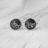 Capricorn cufflinks: Showcasing the unique Sea-Goat design—with its strong goat forelegs and fish tail—on sterling silver cufflinks, elevated by an oxidized finish that adds depth and a vintage character to the piece. This Capricorn zodiac sign is known for its hard work and practicality.