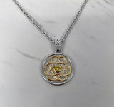 This beautiful sterling silver Celtic pendant features an intricate knot design with flowing, curved lines, showcasing the artistry of Celtic tradition. A yellow cubic zirconia stone sits at its center, accented by two-tone gold plating. A timeless symbol of connection and eternity.